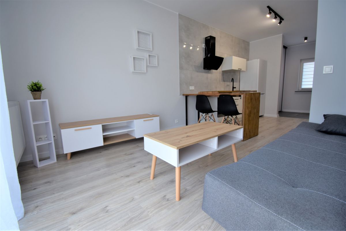 salon z aneksem kuchennym i wyjściem na słoneczny ogród,